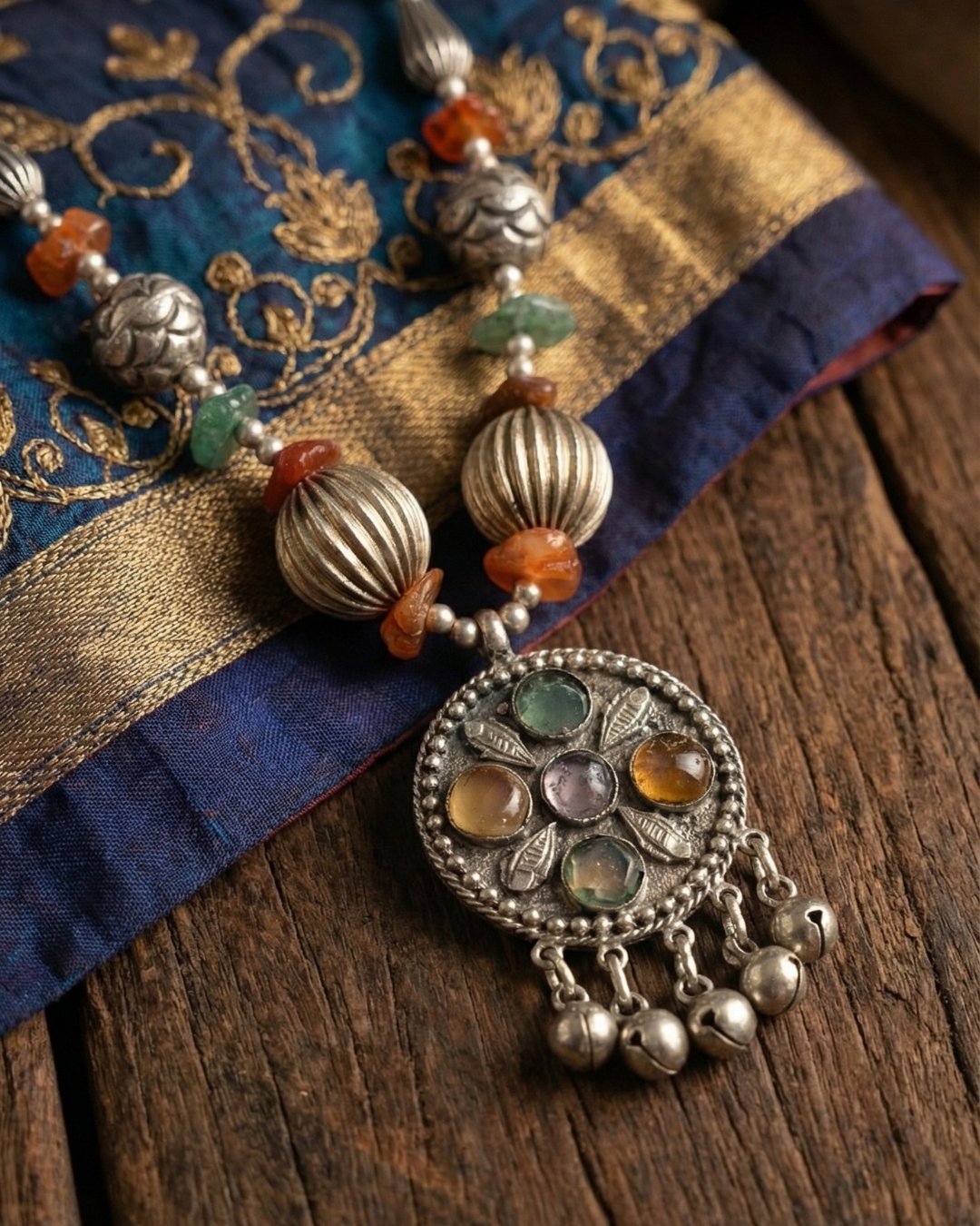 Crafted with a vintage-inspired spirit, the Moonlit Silver Beads Neckpiece from Boheva blends intricate detailing with timeless appeal. Featuring textured silver-tone elements and natural stone accents, this piece adds quiet elegance and character. Its balanced design makes it ideal for both occasion wear and refined everyday styling.